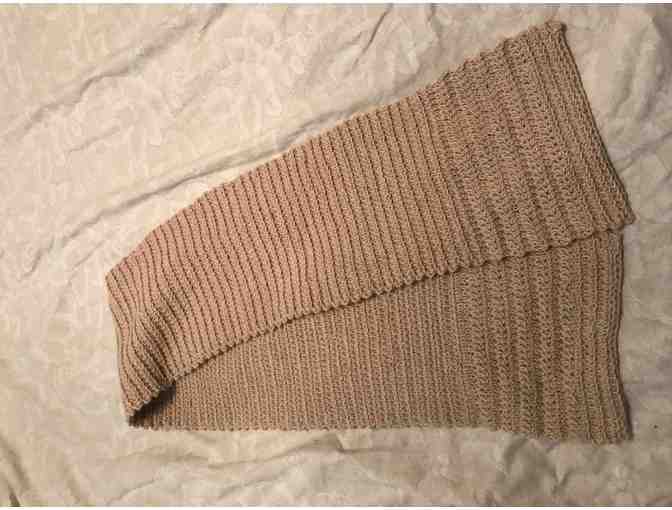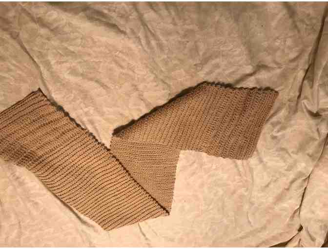 100% Alpaca Handmade Scarf! This scarf was crocheted by Seeing Eye Graduate Lisa Calhoun, who is currently working with her 5th Seeing Eye Dog, Cricket. It is made from 100% Alpaca fiber and no dyes were used on it, the color is the true color of the Alpaca it came from, a beautifully elegant light brown. It took her two weeks to complete this wonderful scarf. She used the half double crochet stitch for the majority of this scarf, so that it would be a tighter weave. A double crochet stitch was used near each end, to add a little contrast. Alpaca is extremely warm and usually does not irritate the skin like wool can. Most people who are allergic to wool can wear Alpaca. It measures approximately 54 inches long and 8 inches wide. It has a lot of stretch to it and the measurements were taken with it laying flat and not stretched out. A side note, the Alpaca this fiber came from is owned by a friend of Lisa’s and she has met him in person. He is a sweet Alpaca living on a farm in Virginia.
