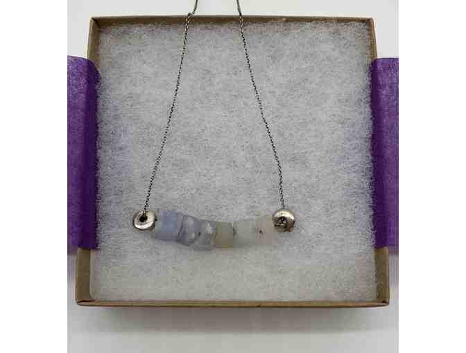 Adorn yourself with Mashka's lovely necklace of natural blue agate druzy to help promote inner stability, composure and maturity. Six blue agate druzy "slices" are smooth matte on the outside, but rough cut on the inside, are bookended by 2 flat silver beads. Each slice is approximately 12mm in diameter and 4-6mm in width. The colors range in order from smoky white to a light smoky blue. A hole in the middle of each agate slices allows the beads to slide along a delicate antiqued sterling silver loop chain (19" in length including a 2" extension). Necklace will stay safely on your neck with a lobster claw clasp with another small piece of light blue agate druzy on the end.