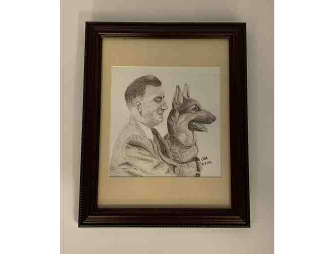 This sepia-toned pencil drawing of the first Seeing Eye team, the great Morris Frank and his German shepherd Buddy is a classic. Matted and framed, this piece measures 7 inches square, and is nicely matted in an 8.5 inches by 11 inch cherry wood frame.