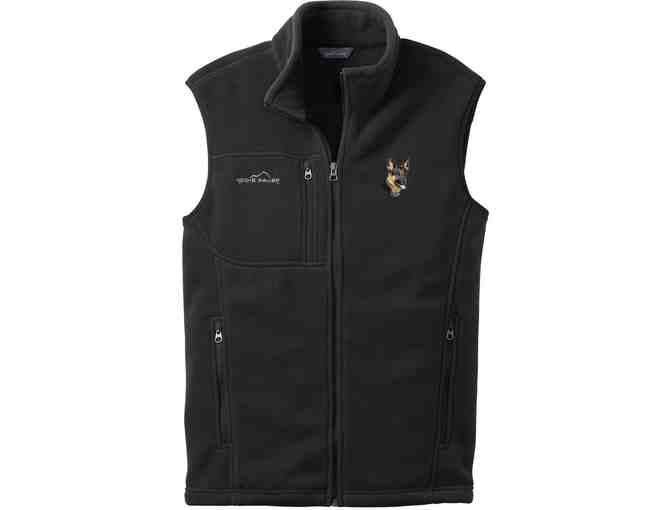 This German shepherd vest is perfect for fall hikes and everyday excursions! This black fleece, embroidered Eddie Bauer vest is super soft, warm and as comfortable as it gets. The smiling German shepherd face is on the upper left side of the front of the vest.