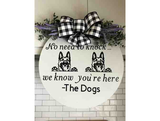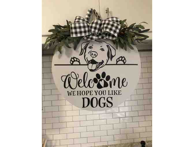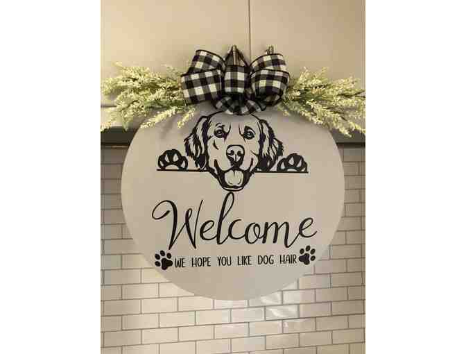 Welcome your guest with this Personalized Dog Door Hangers! This Personalized Dog Door Hangers are the perfect added touch to hang all year round. These door decorations can be hung outside to welcome your guests or displayed inside next to your seasonal decor. This hand stained or painted .25" blank wood round background will bring a Farmhouse or Southern feeling to your home no matter where you live. All wording and dog breeds can be changed and customized to your liking.