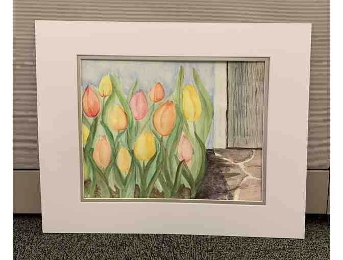 "Spring Welcome" is a beautiful watercolor painting of yellow, orange and pink tulips. The image is a close-up of the tulips, with a hint of the bottom corner of a front door and stone path off to the side. By artist Janet Jones.