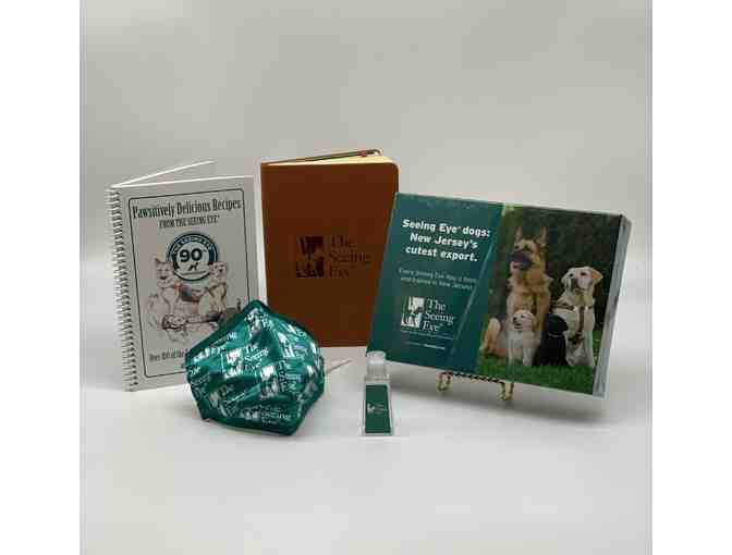Also included in this lot is a green Seeing Eye logo mask, "Pawsitively Delicious Recipes" a spiral-bound cookbook filled with Seeing Eye graduates' favorite recipes from the Seeing Eye kitchen; a light tan leather-bound journal with the Seeing Eye logo embossed on the cover, and a 1 oz bottle of hand sanitizer.