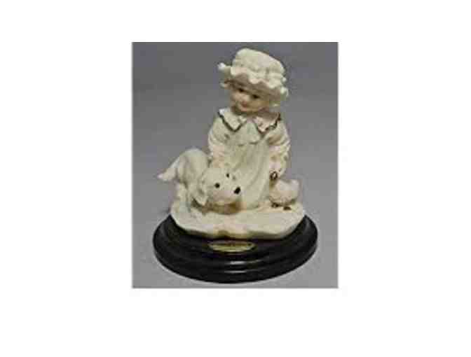This delicate and touching figurine by Italian artist, Giuseppe Armani, captures the gentle love a child has for their faithful, playful puppy and adorable duck. Beautifully detailed, the off-white figurine shows a classic child kneeling in a bonnet and sleeping gown with hands lovingly on the puppy and duck to either side. The thoughtful and realistic details clearly convey the affection between the three with a peaceful expression on the child’s delicately painted face and the puppy’s playful crouch to the gold painted trim on the child’s collar and duck’s beak and feet.