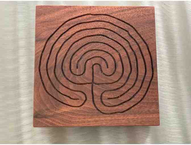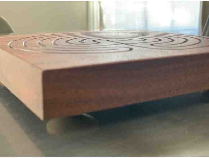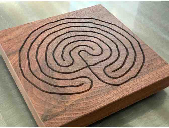 This labyrinth is engraved in walnut wood and is finished to perfection with an elegent lift from the added feet on the reverse. Lovely craftsmanship.