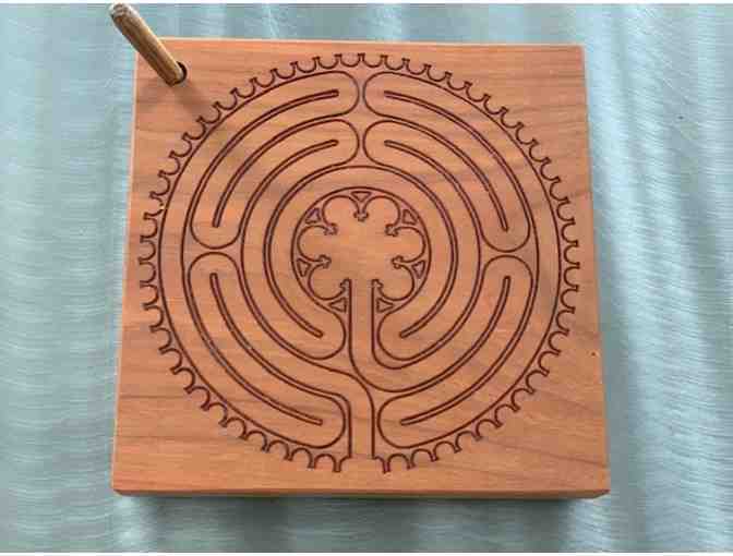 This labyrinth is engraved in Cherry wood and is finished to perfection with an elegent lift from the added feet on the reverse. Lovely craftsmanship. Comes with Stylus to follow the path!