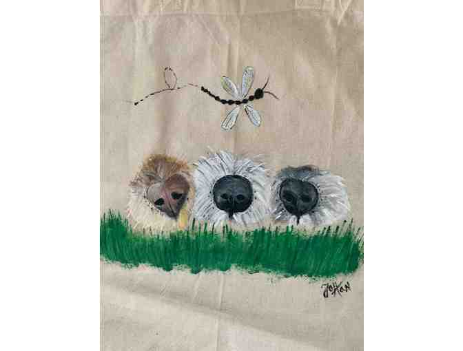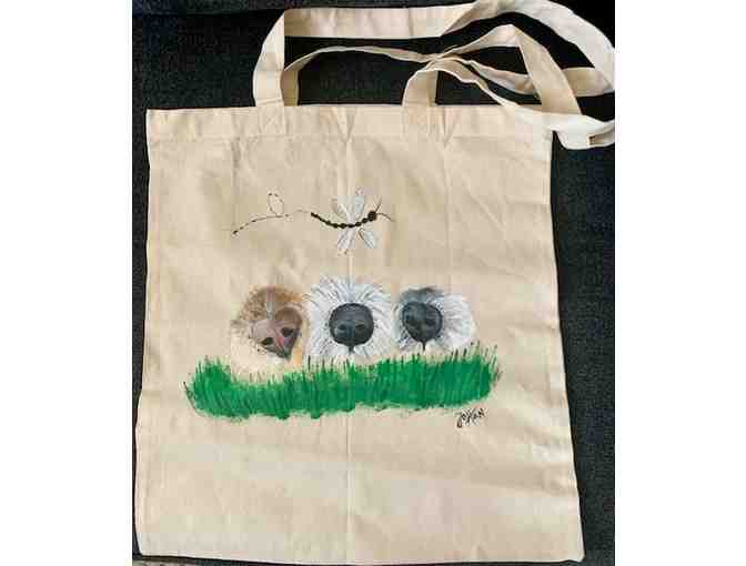 Unique one of a kind hand painted tote bag. 16"high, 15"wide. Handles have a 12"drop