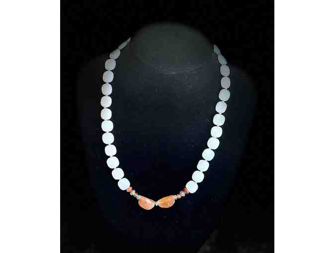 Beads Necklace: Larimar, Carnelian, Swarovski crystals and silver clasp. The necklace is 16 inches long and lays flat.