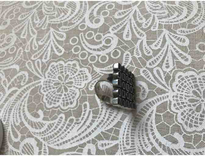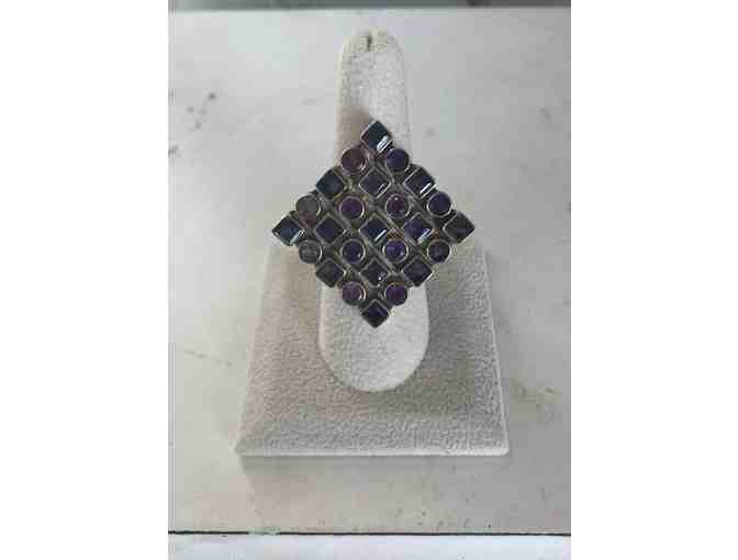 Condition is new without tags (never worn, but has been tried on). Stone cluster square measures 1" x 1". Band width is 5/16". Stamped 925 inside band. Weight is 17 grams.