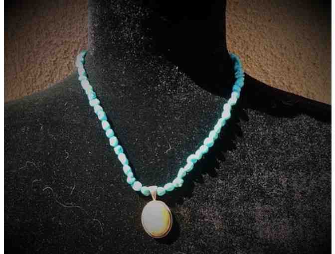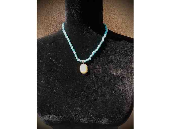 Gorgeous turquoise strand with yellow jade and sterling silver pendant made by Peyote Bird Designs in Santa Fe, NM. Stamped PB and .925 on back of pendant. Adjustable with silver chain and lobster catch, necklace is 18" in overall length.