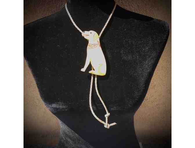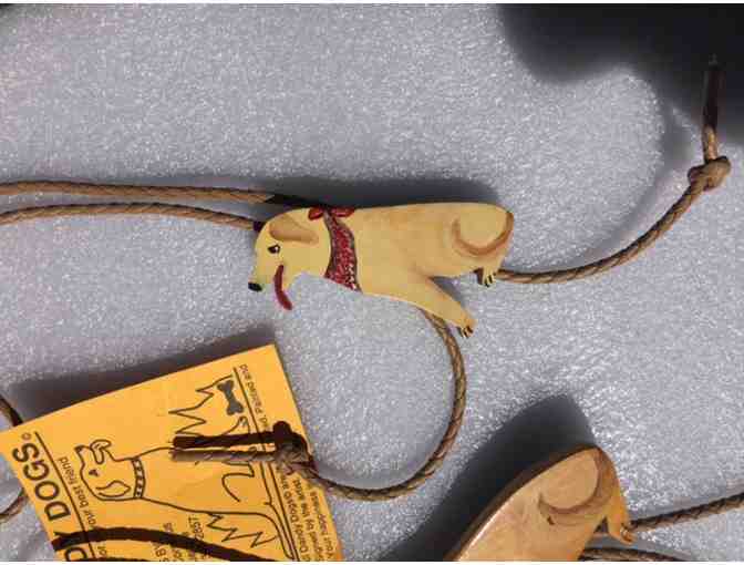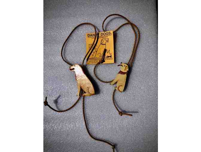 2 unique and one of a kind Bolo ties of Yellow Labradors! Hand painted and unique, they are handmade out of wood and individually designed. One is small 3" and the other medium at 4" on braided lariats. Made by Emily Cornelius of Albuquerque NM, owner of Dandy Designs. They are vintage, 1989!