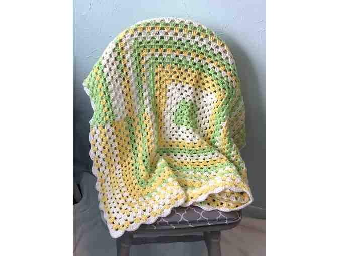 This hand crocheted baby blanket measures 39"x39" and is soft and cozy. Finished with a scallaop edge! Sure to fit any decor, this blanket is machine washable and made in a smoke free home.