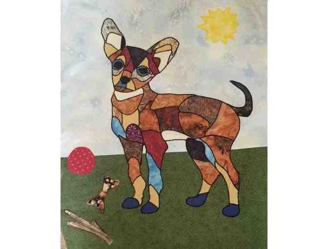 Chihuahua quilted wallhanging. It measures about 27"x31" and has a sleeve for easy hanging. It can also be used as a table topper. This is an adorable Chihuahua with many pieces of applique to make up his charming personality. I love quilting and applique work.