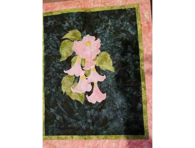 Beautiful, elegant peach colored appliqued flowered wall hanging. It measures 28x35 and it has a sleeve for easy hanging.