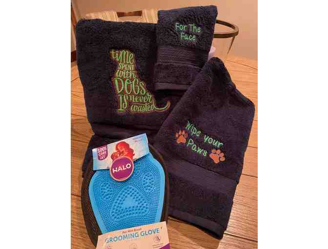 Custom embroidered set of dog bath towels in navy blue. Oversized bath towel 53 x 30, hand towel and face cloth. Very plush, high quality. Grooming mitt also.