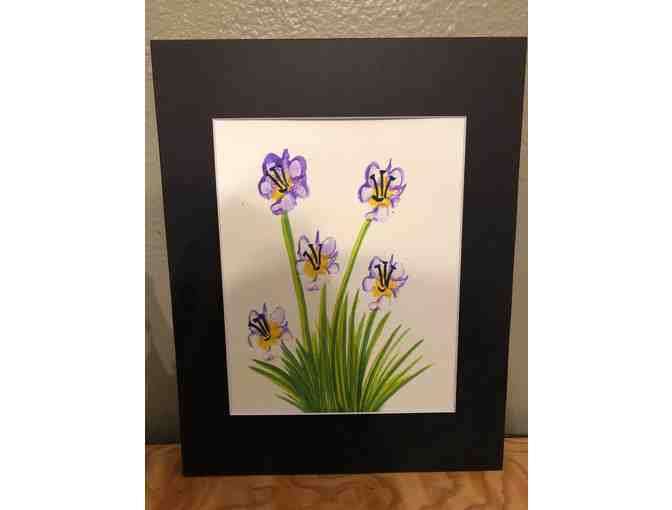 Printed paw prints turned into flowers. These prints are matted in an 11 x 14 frame with a clear plastic sleeve and include a photo of the furry artist on the back.