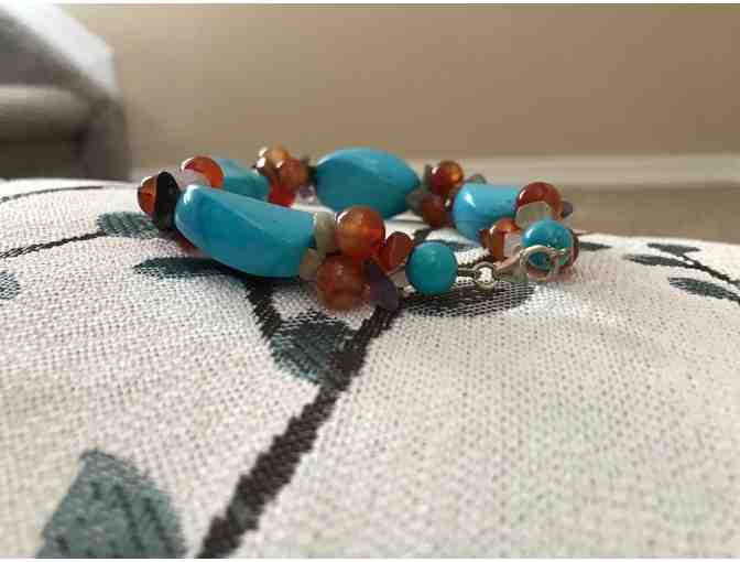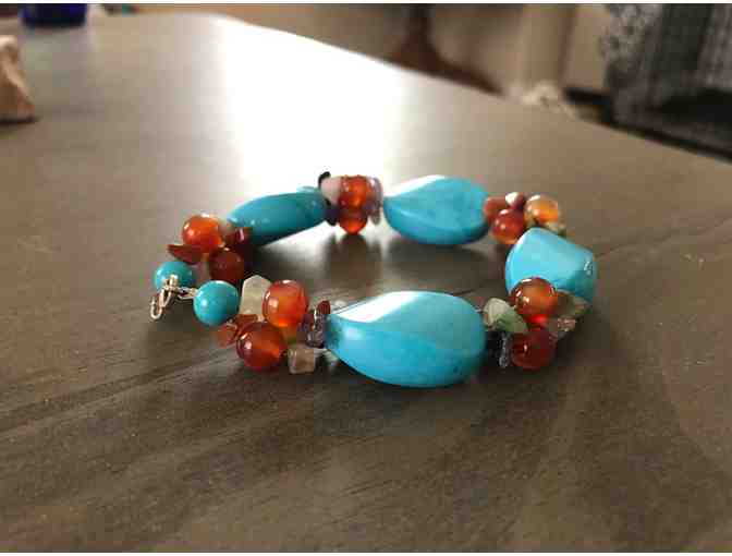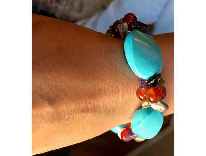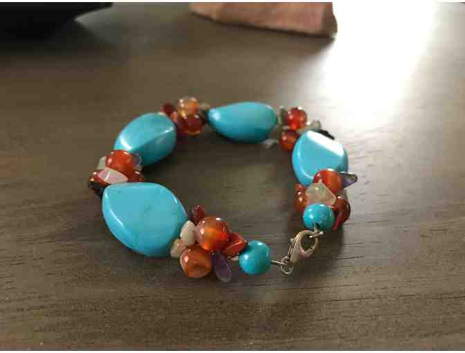 This beautiful bracelet is absolutley stunning! Genuine Turquois, Peridot and Topaz with a sterling silver lobster clasp. Perfect for the Spring and Summer wardrobes! The bracelet measures 8 inches.