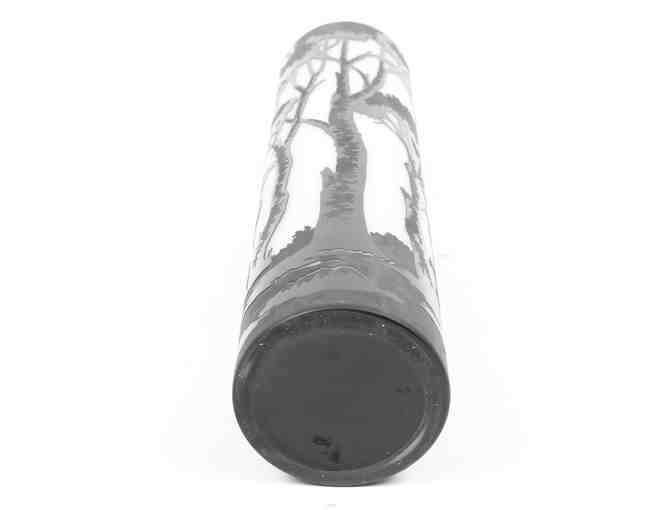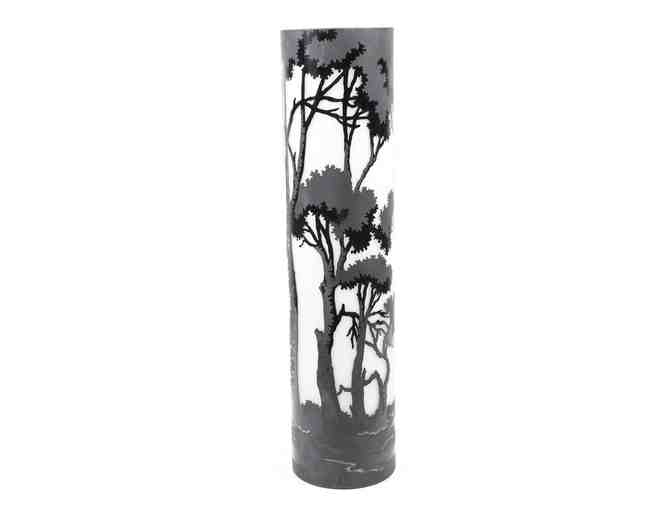 A striking contemporary black on white cameo cased glass vase. The cylindrical vase is features a landscape scene in matte and glossy black silhouette over frosted white. The interior of the vase is glossy white. It is unsigned. New in box. Dimensions 5.0" W x 19.5" H x 5.0" D