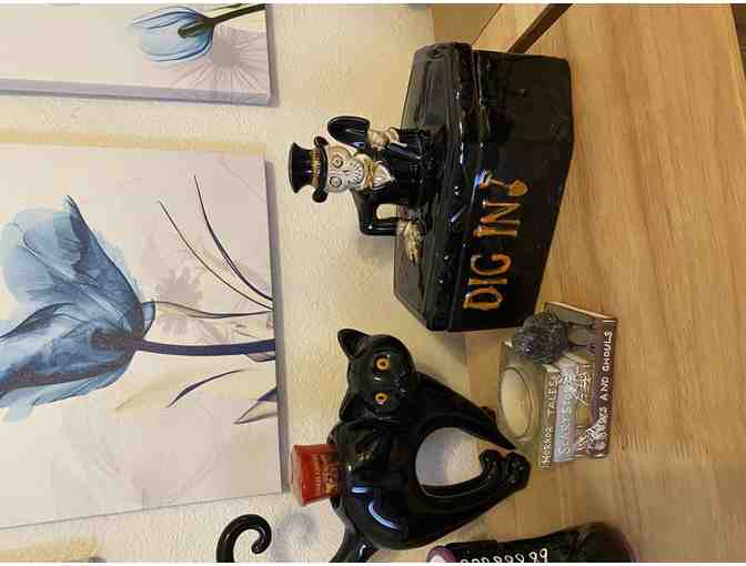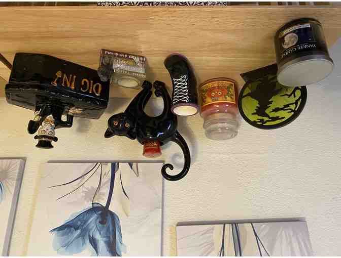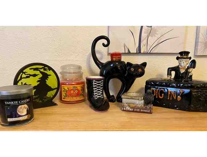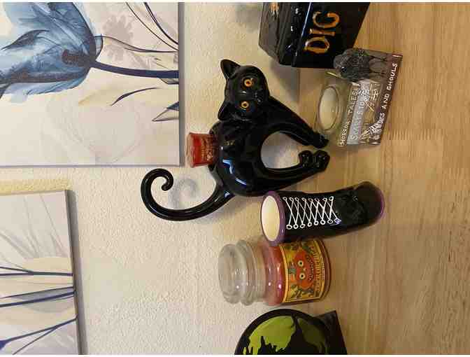 Happy early Halloween!! Included in this hodgepodge of tea light holders is a "Dig Here" candy coffin container. Also included are two Yankee candles one is "Trick or Treat" and "Midnight Moon" scent. Although these items were purchased in the mid-2000s I believe all are available on Ebay and Yankee Candle itself.