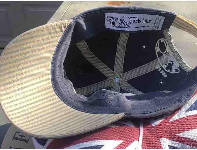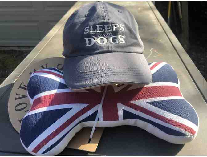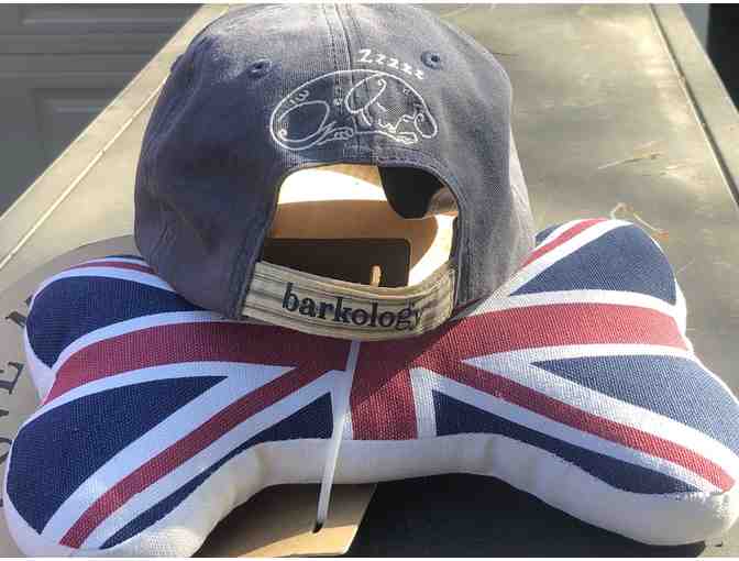 Brand New Barkology baseball cap. Vintage Navy Blue color, one size fits most (adjustable velcro strap) Polyester filled Dog Bone Toy, 10.5" in length, British style print on canvas
