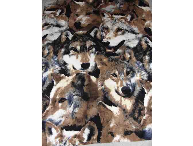 Wolves scene on fleece on the front and grey fleece on the back of the blanket. 100%polyester anti pill fleece Length of blanket is 57" x 71"