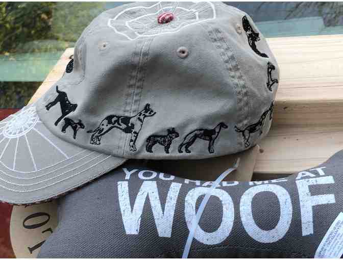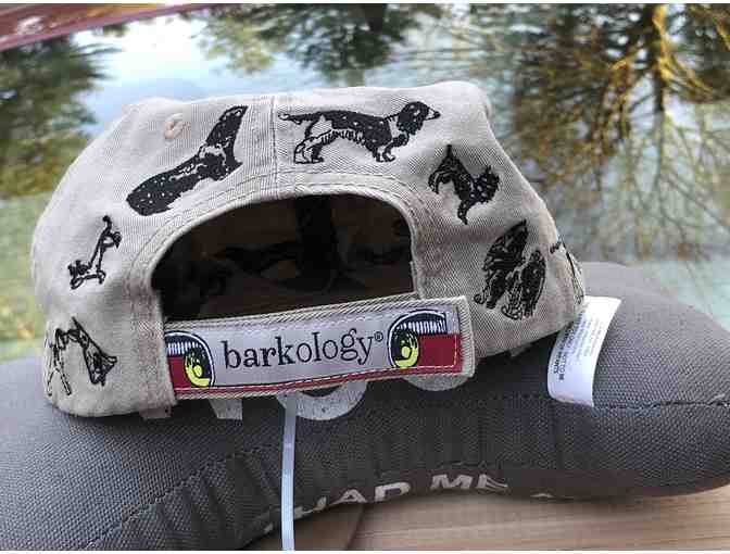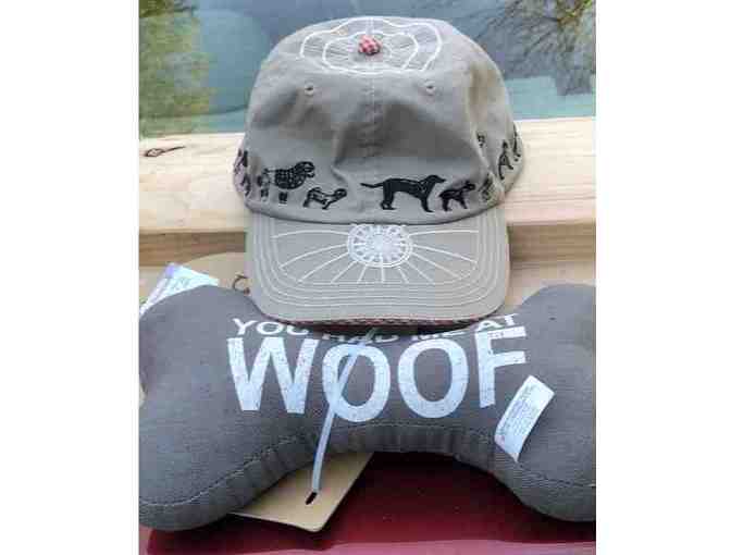Brand new Barkology baseball cap. Khaki, one size fits most (adjustable velcro strap). Polyester filled Dog Bone Toy, 10.5" in length, canvas with 'You Had Me At Woof' printed on it.