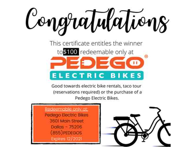This certificate is valid for $100 which can be used towards electric bike rentals, taco tour (reservations required), or the purchase of a Pedego Elecric Bike.