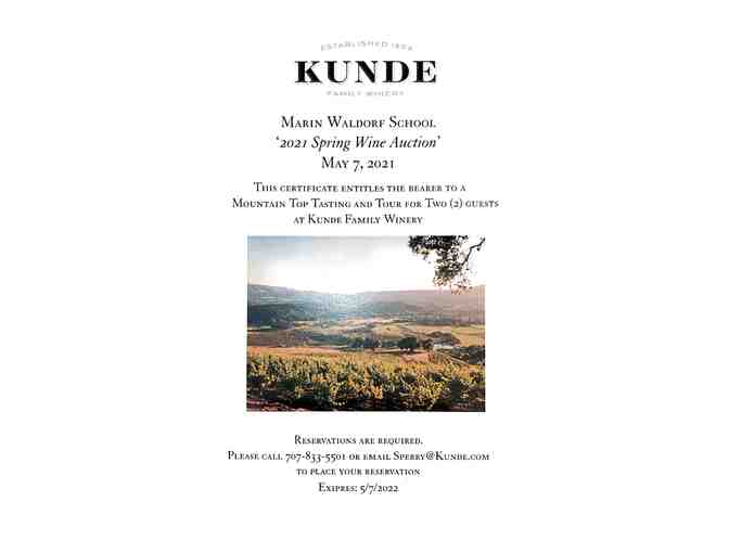 This certificate entitles the bearer to a Mountain Top Tasting and Tour for Two (2) guests at Kunde Family Winery. 2 hour tasting includes a wine & cheese pairing set on the mountainside at 1,400 ft.