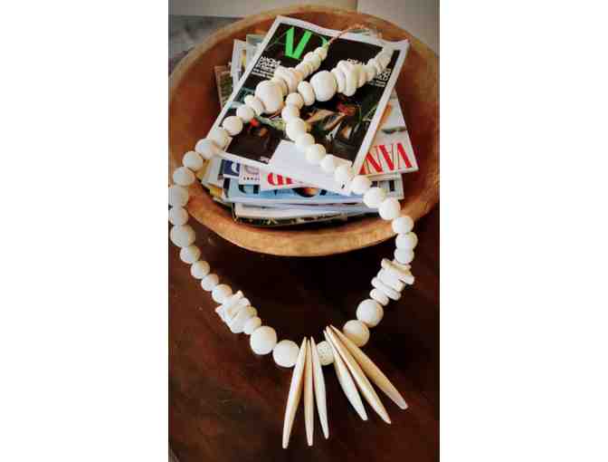 Made with hand rolled clay beads by our third graders and cuttlefish bone, each piece meticulously shaped to perfection, before being finalized on copper wire. This hand crafted piece is made by our children with organic materials and will take on its own form and variations; therein lies its beauty.