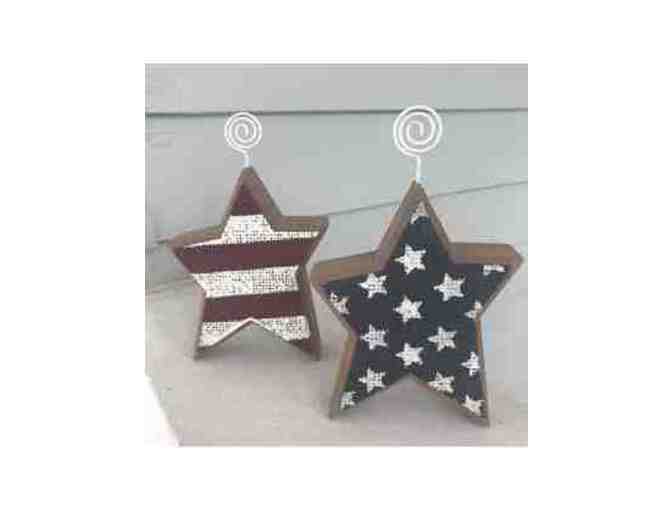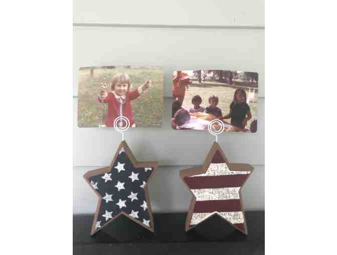 Display your patriotic pride with these fun Stars & Stripes picture holders! They work well for photos or small signs! With no frame, changing your display is easy!