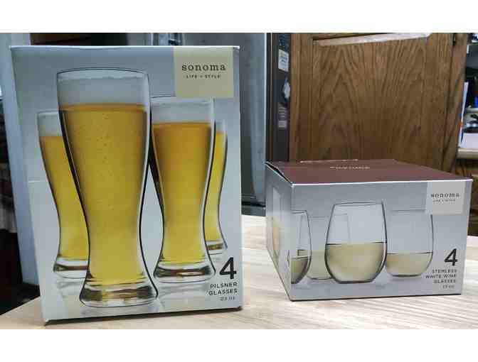 This glass set includes four Pilsner glasses and four stemless white wine glasses.