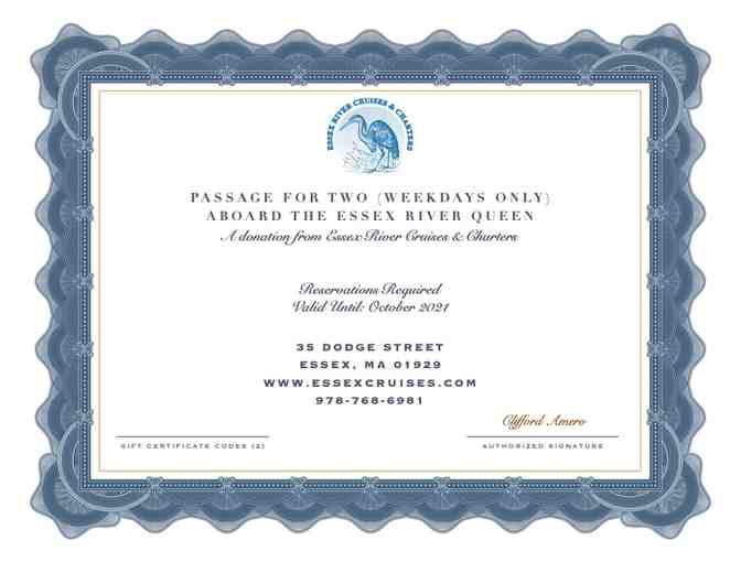 Join us for a 90-minute narrated sightseeing cruise aboard the Essex River Queen! Two passes -- valid weekdays only. Reservations required!