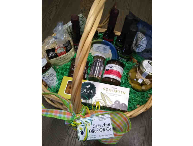 Basket is a sampling of Cape Ann Olive oil Co. Olive oils, balsamic vinegars, olives, dips and spreads, local pretzels and cookies and lots more.