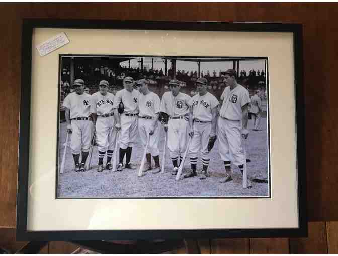 This photo was taken on July 7th, 1937 at Washington D.C.'s Griffith Stadium. Picturing members of the American League All-Stars, left to right: Lou Gehrig, Joe Cronin, Bill Dickey, Joe DiMaggio, Charley Gehringer, Jimmie Foxx, and Hank Greenberg.