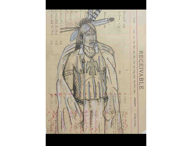 This piece, titled "Young Yankton Sioux Warrior," depicts a Sioux Warrior from the Missouri River region wearing a hide robe and a thunderbird necklace. Created by Inkpa Mani. The artwork is ink and pencil on antique ledger paper. The size is 8x6.5 inches.