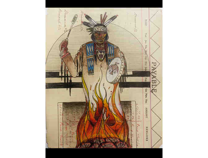 This piece, titled "Grandfather Stone Singing To You," depicts the Sioux ceremony of Inipi (the cleansing ceremony where the spirit of the stone has come up from the grandfather stone to sing songs to the people). The man is dressed as a Dakota Sioux. Created by Inkpa Mani. The artwork is ink and pencil on antique ledger paper. The size is 8x6.5 inches.