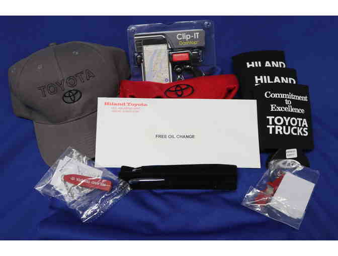 Includes: Free Oil Change at Hiland Toyota in Moline, IL, Toyota polo, Toyota cap & beanie, Clip-It Dashtop, and more!