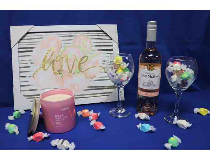 Includes: "Love" picture frame, Castillo San Simon Rose, 2 Wine Glasses, Sonoma Rose All Day candle, and taffy.