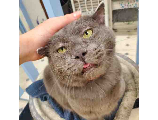 Hey there. They call me Blaze, Potato, Big Chicago. I AM an official greeter and I'm here to tell you I am on NO diet. I love my staff and I love my food. So purrease donate to our canned food stash. I've been counting the cans in the storage bay and they sure go down fast. So help a guy out (yea, I'll share) and donate to our canned food fund. It would be apurrciated. Back to my nap in my box by the door.