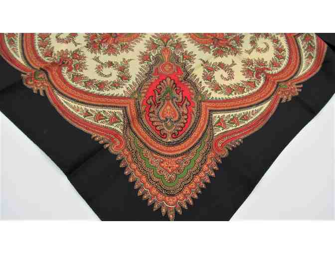 This beige, red, rust and green center design edged in black would be beautiful as a headscarf or around your neck or shoulders as an accessory. Very light weight silk; soft to the touch. The intricate pattern is brilliant against the black border. Previously owned but in perfect condition.