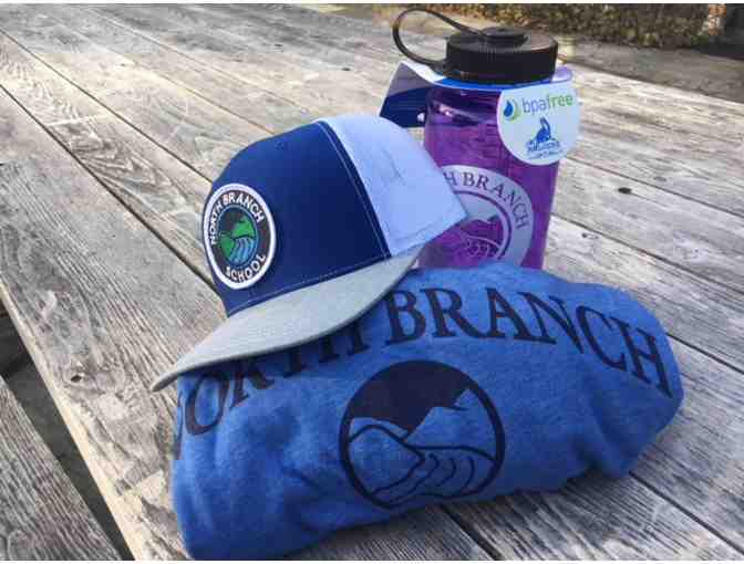 All you need to rep North Branch School for warmer weather or all year around! This package includes cotton blend long-sleeved t-shirt (so soft! and you choose desired size) 32oz Nalgene (in Prune purple) and NBS-logoed trucker hat (your choice of blue or green.)