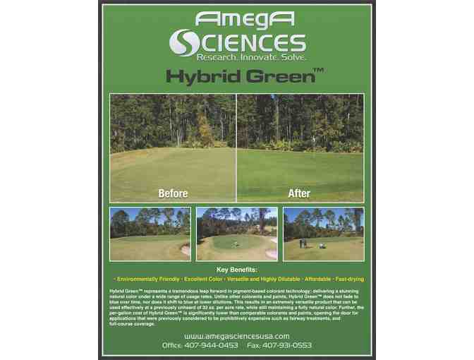 Hybrid Green represents a tremendous leap forward in pigment-based colorant technology; delivering a stunning natural color under a wide range of usage rates. Unlike other colorants and paints, Hybrid Green does not fade to blue over time, nor does it shift to blue at lower dilutions. This results in an extremely versatile product that can be used effectively at a previously unheard of 32 oz. per acre rate, while still maintaining a fully natural color. Further, the per-gallon cost of Hybrid Green is significantly lower than comparable colorants and paints, opening the door for applications that were previously considered to be prohibitively expensive such as fairway treatments, and full-course coverage.