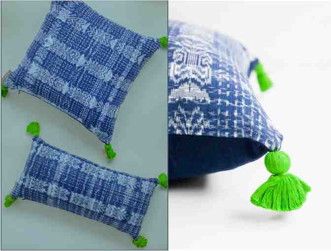 Vintage Indigo Pillows: Set of 2 with Green Tassels