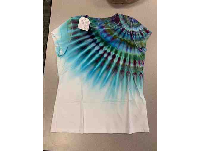 Custom made shoulder tie dye. This beautiful crew neckline, cap sleeves and Peacock colors can be yours. It's one of a kind and perfect with you favorite jeans.