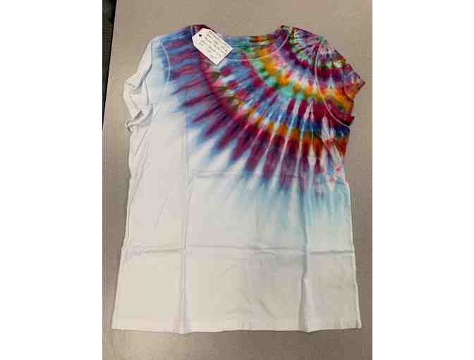 Custom made shoulder tie dye. This beautiful crew neckline, cap sleeves and Peacock colors can be yours. It's one of a kind and perfect with you favorite jeans.