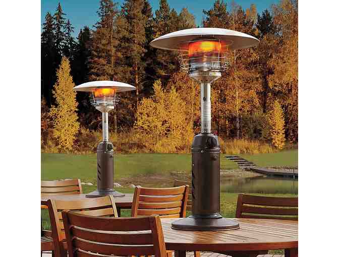 Extend patio season into the fall and enjoy everything the season has to offer by warming up your outdoor room with this Tabletop Patio Heater that heats up to 30 sq. ft. It has textured steel bronze finish. Tip over shut-off and oxygen depletion sensor for safety. It works with a 1 lb. propane cyclinder (not included).