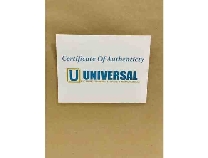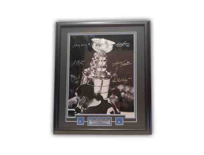 This frame contains a single licensed photo of Captain George Armstrong of the Toronto Maple Leafs, raising the Stanley Cup. The original photo was signed by Johnny Bower, Larry Jeffrey, Eddie Shack, Len 'Red' Kelly, Larry Hillman and Bobby Baun. This is a licensed print reproduction of the original photo. Includes a Certificate of Authenticity and measures 23"W x 27"H.