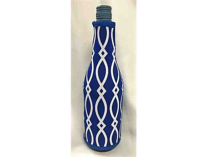 The perfect stocking stuffer, this blue and white wine bottle coozie will help keep the wine cool by the pool or at the beach!