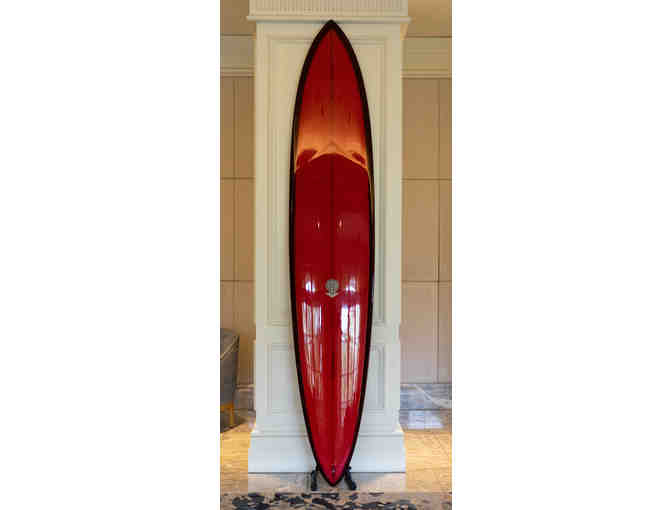 This board has a wedge stringer that is wider in the nose at 3/8’’ to 1/8’’ bass in the tail, this makes the nose stronger and heavier to get the nose down the face of the wave. The narrow stringer in the tail allows the board to flex and provide a bit more drive off the bottom. The bottom of this board has a slight rolled nose entry into a light single concave center into a slight spiral vee around the glassed-on fin. This board is meant for large clean open face waves. The bottom has a deep red wine resin tint and a red tint top and rails. Tyler hand drew the logo and designed the fin template as well. Enjoy the Ride!