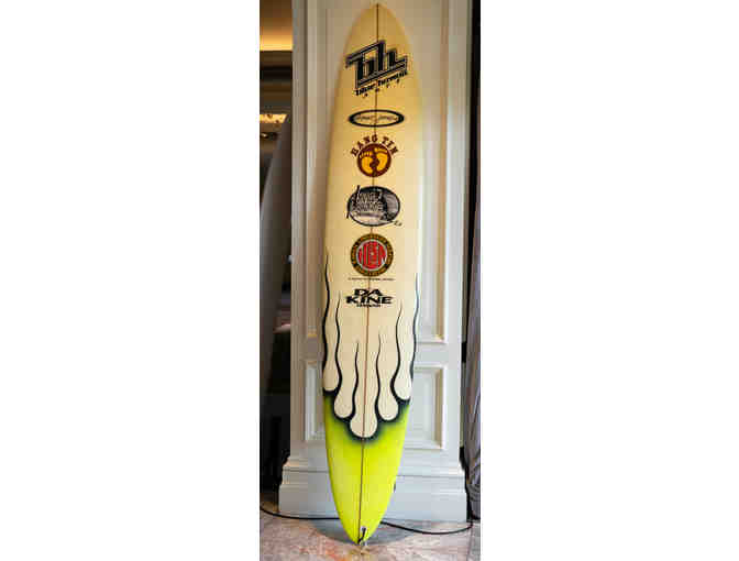 The surreal lore of the Paskowitz family was portrayed to me through the pages of surfing magazines, and a rare, albeit distant, sighting of the motor home and clan at San Onofre. Almost two decades later a friend alerted me to a used performance longboard at Bruce Jones’ surf shop in Sunset Beach (circa 2000 - 2001). I had sold my first company and moved back from Santa Cruz to south OC and needed a racy longboard. The flames harkened back to a custom AIPA stinger I had in high school, the thin rails and the dramatic pintail spelled performance, and the stunning logo of Izzy arching back on a one-foot wave rendered me smitten. I had to buy it. And perform it does. More decades have since elapsed. About a year ago I noticed Izzy’s local charity and thought, “I’d like to donate this board to his charity.” More time, and then I had the chance encounter of meeting Izzy’s brother, Abraham, at ISURUS wetsuits this July and told him about the board and my desire to offer it for the charity. He stated the provenance of this board: Bruce Jones (“BJ” initials on the bottom) had made it “For IZZY”, for a surf trip to Tavarua. here we are at the lovely Ritz-Carlton above Salt Creek. A lovely specimen to hold, gaze upon, and ride.